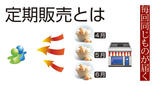 同じ商品を継続的にお届けする販売方法です。お届けの周期はお客様 or サイト管理者指定で、お客様からの中止申請があるまで、商品を定期的にお届けします。